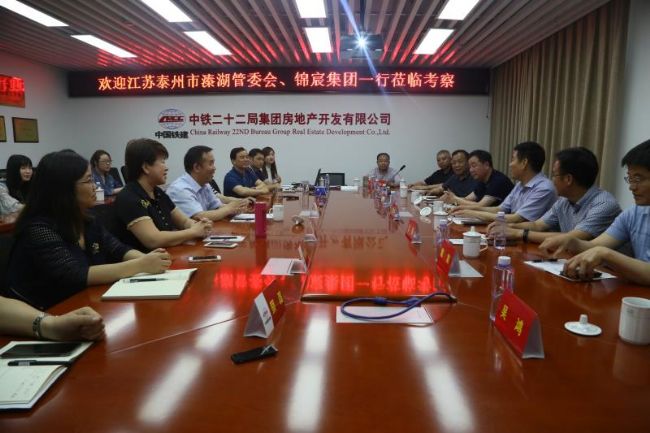 5月17日下午,溱湖旅游度假區(qū)管委會(huì)主任王榮明,錦宸集團(tuán)董事長(zhǎng)李煥軍、董事黃蘇成、采購(gòu)供應(yīng)部部長(zhǎng)翟步祥一行至中鐵二十二局房地產(chǎn)公司考察調(diào)研,中鐵二十二局集團(tuán)公司副總經(jīng)理、總會(huì)計(jì)師趙世友,集團(tuán)地產(chǎn)董事長(zhǎng)、黨委書記熊乾,總經(jīng)理陳慧英參加活動(dòng)。