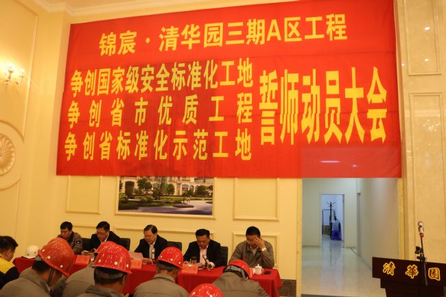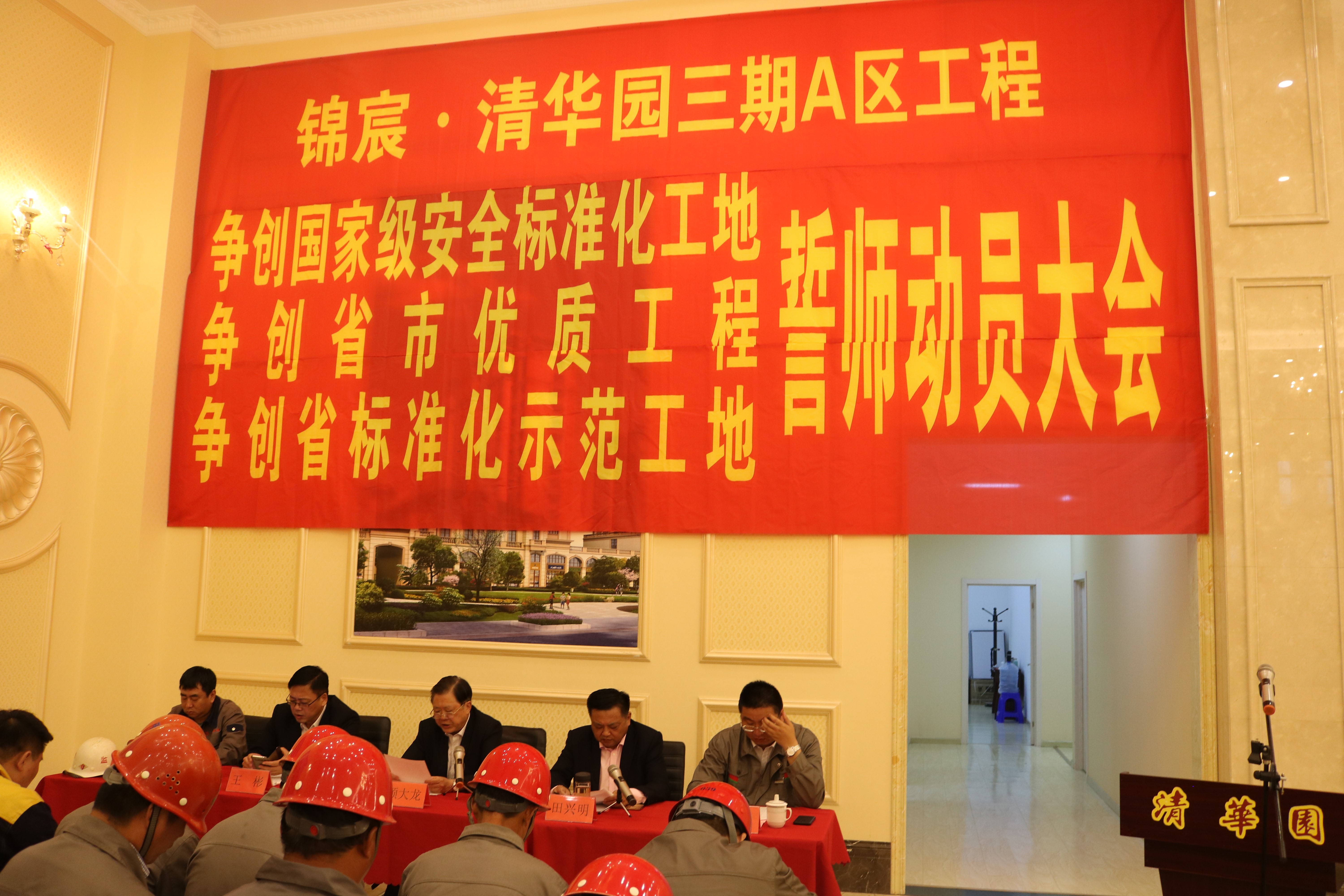 528日,吉林錦宸房地產開發有限公司、錦宸集團有限公司梅河口直屬項目部在吉林省梅河口市清華園售樓中心召開了清華園三期工程A標爭創吉林省“長白山”杯優質工程暨爭創國家“三A”級工地、吉林省房屋建筑工程標準化工地誓師動員大會,項目部、監理部、物業部、開發公司全體管理人員、各勞務班組負責人、材料供應商、房屋銷售人員等120多人出席了會議;會議由開發公司常務副總田興明同志主持,集團公司領導顏大龍同志作了題為《精益求精再鑄省優工程    一心同功爭創標化示范工地》的動員報告;項目經理吳偉等11名同志作了表態發言。會議要求全體管理人員、勞務負責人充分認識爭創吉林省“長白山”杯優質工程的重要性,爭創國家“3A”級工地、省標準化工地的必要性,進一步狠抓當前生產、搶抓銷售機遇的緊迫性。確保二期工程2018910日前交房、三期A標段8月份全面封頂、三期B標段9月份破土動工。確保清華園質量口碑、現場口碑繼續名列梅河前茅!確保社會效益、企業經濟效益雙豐收!