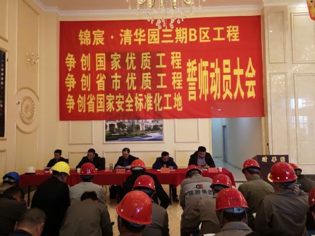 2019年4月28日下午3時(shí),吉林錦宸房地產(chǎn)開發(fā)有限公司、錦宸集團(tuán)有限公司梅河口直屬項(xiàng)目部在吉林省梅河口市清華園售樓中心召開了清華園三期B區(qū)工程爭(zhēng)創(chuàng)國(guó)家優(yōu)質(zhì)工程、爭(zhēng)創(chuàng)省市優(yōu)質(zhì)工程、爭(zhēng)創(chuàng)省國(guó)家級(jí)安全標(biāo)準(zhǔn)化工地誓師再動(dòng)員大會(huì),項(xiàng)目部、監(jiān)理部、物業(yè)部、開發(fā)公司全體管理人員、各勞務(wù)班組負(fù)責(zé)人、材料供應(yīng)商、房屋銷售人員等100多人出席了會(huì)議,會(huì)議由開發(fā)公司副總經(jīng)理王彬同志主持。
