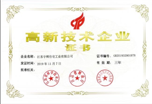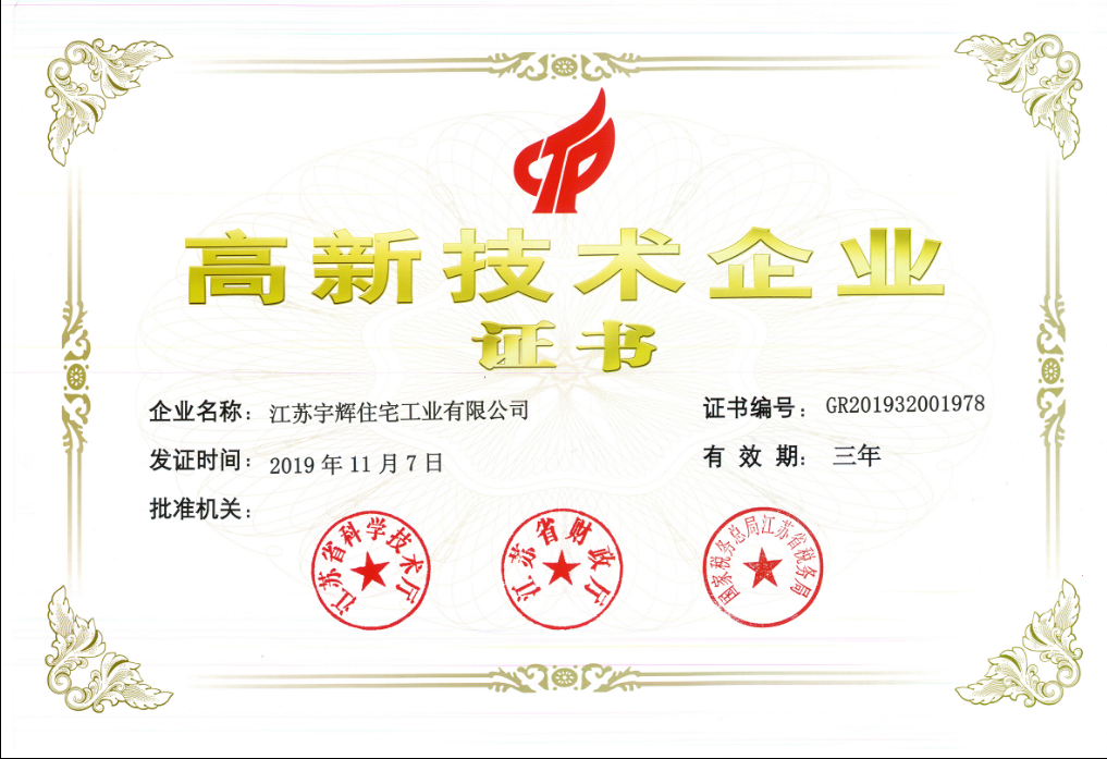 近日,江蘇宇輝住宅工業有限公司順利通過全國高新技術企業認定管理工作小組認定,成為國家高新技術企業。
