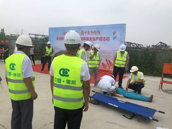 啟動儀式上,泰州體育公園項目應急救援小組舉行了“觸電事故”應急救援預案演練。