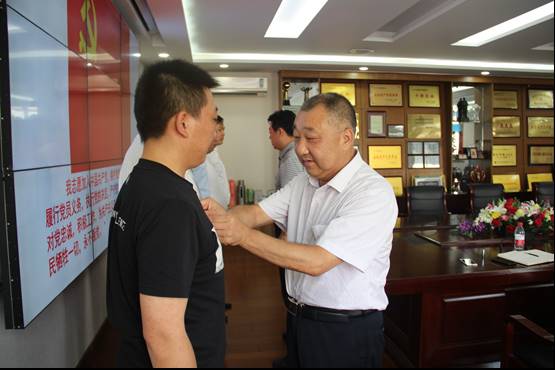 集團公司黨委書記王春林、紀委書記韓祥鳳同志上前為六位同志細心、嚴肅、一個一個的佩戴上黨徽。