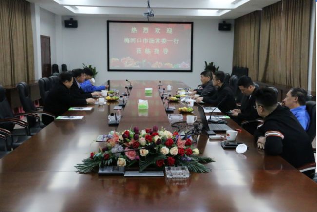 2021年4月11日上午, 梅河口市委常委、統戰部部長湯培成、住房和城鄉建設局局長李永發、住房和城鄉建設局建工科科長劉吉忠、人民政府辦公室綜合科科長吳謙一行蒞臨江蘇宇輝指導工作。集團公司董事長李煥軍、顧問顏大龍,江蘇宇輝總經理全文林、副總經理兼總工程師吳仲勤參加活動。