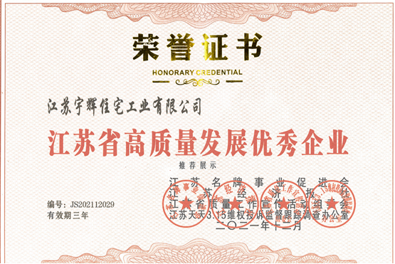 近日,由江蘇名牌事業促進會、江蘇經濟報社、江蘇省質量工作宣傳活動組委會、江蘇天天3.15維權投訴監督跟蹤調查辦公室聯合評選的“江蘇省高質量發展優秀企業”、“江蘇省建材行業示范企業”出爐,江蘇宇輝住宅工業有限公司成功入選。