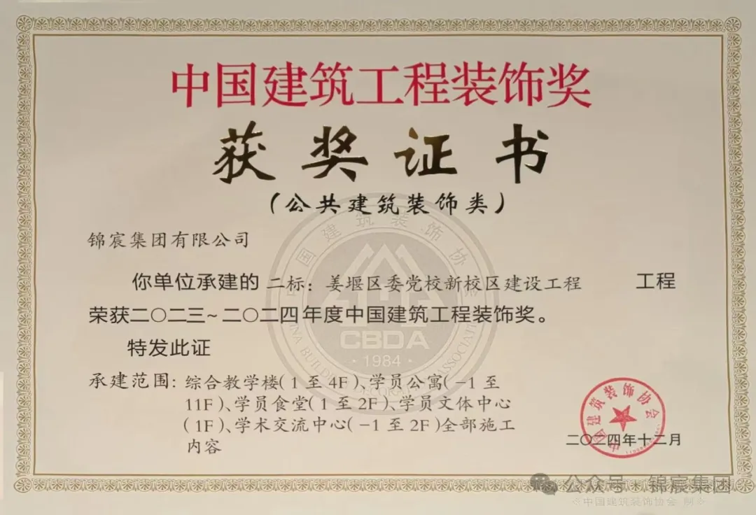 喜報!錦宸集團承建的姜堰區委黨校新校區建設工程榮獲中國建筑工程裝飾獎