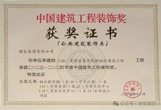 中國建筑工程裝飾獎是經住房和城鄉建設部批準,由中國建筑裝飾協會主辦的評選活動,是中國建筑裝飾行業的最高榮譽獎,代表了全國建筑裝飾裝修領域內工程質量最高水平。