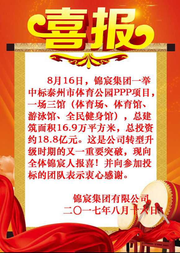 熱烈祝賀錦宸集團中標泰州市體育公園PPP項目